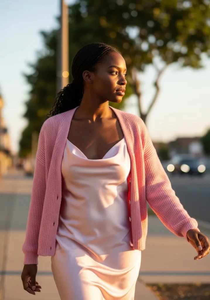 This outfit features a silky soft pink slip dress layered with a matching pink cardigan for a gentle and romantic look. The fabrics feel light and fluid, creating an effortless drape that moves beautifully in natural light. The overall vibe feels calm, feminine, and perfectly balanced for an all pink aesthetic.