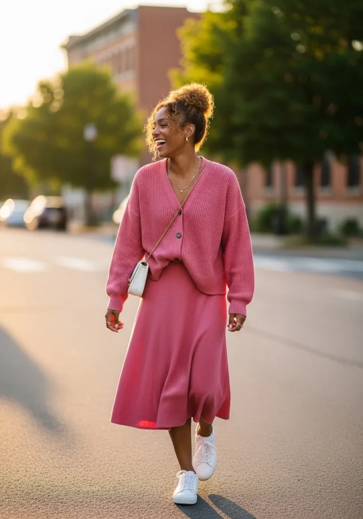 This look showcases a pink cardigan styled as a dress with a matching skirt underneath for a layered all pink effect. The fabric feels soft and slightly structured, creating a clean silhouette with movement. The color feels warm and inviting.