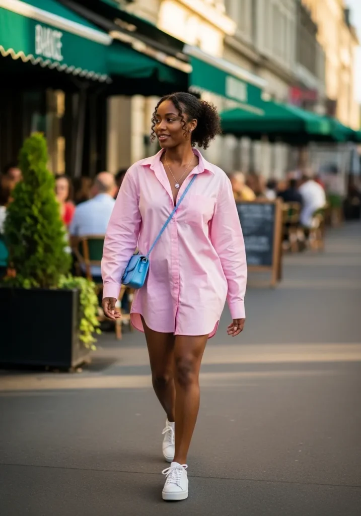 This look features a light pink shirt dress styled casually with white sneakers and simple accessories. The fabric feels crisp but easy, making the outfit playful and wearable. The all pink tone keeps it fresh and clean.