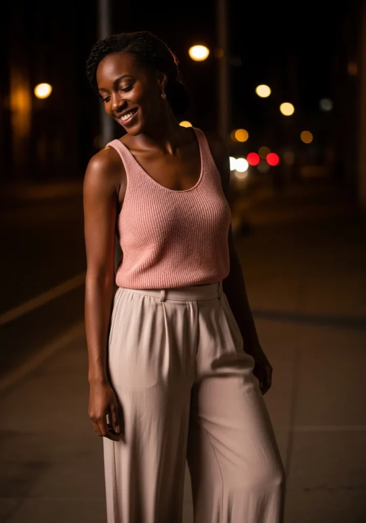 This outfit pairs a soft pink tank top with matching flowy pants for a relaxed and elegant silhouette. The fabrics feel light and drapey, creating beautiful lines while walking. The monochrome pink palette feels calming and refined.
