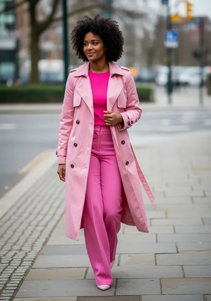 This look features a pink trench coat layered over a matching pink outfit underneath. The structured coat adds polish while the pink layers keep the look soft and cohesive. The overall vibe feels elevated and intentional.
