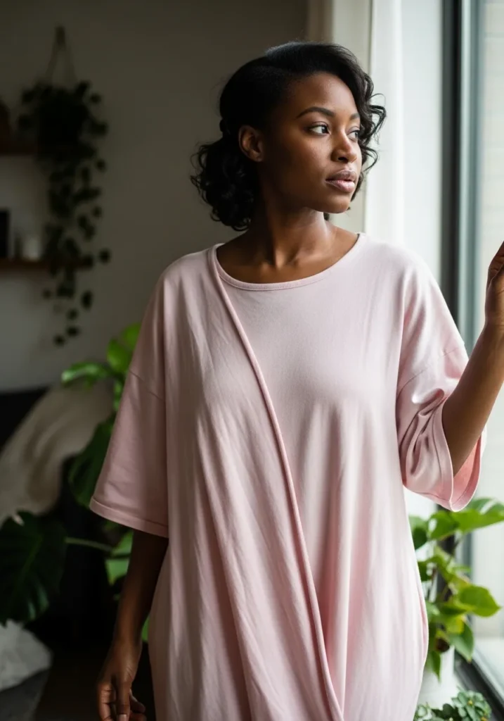 This outfit features an oversized pink tee dress with a loose and airy fit. The fabric looks soft and comfortable, creating a relaxed silhouette that still feels stylish. The all pink look feels effortless and modern.