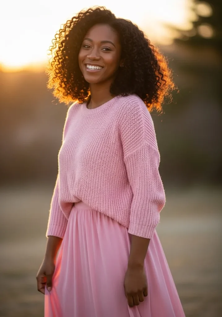 This outfit features a cozy soft pink sweater paired with a light flowing pink skirt that moves gently in the breeze. The knit texture adds warmth while the skirt keeps the look airy and romantic. The all pink palette feels calm, feminine, and glowing in natural light.