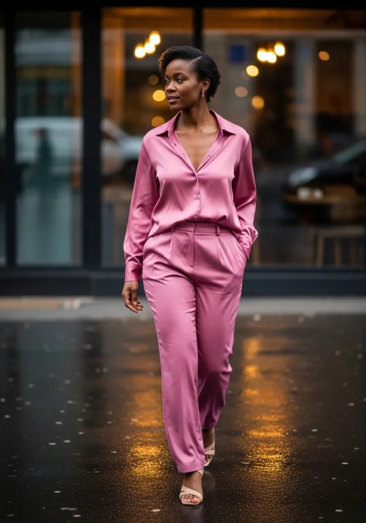 This look showcases a silky pink lounge set with a relaxed button style top and matching trousers. The satin fabric catches light in the prettiest way and gives the outfit a polished softness. The monochrome pink feels elegant even in an urban setting.