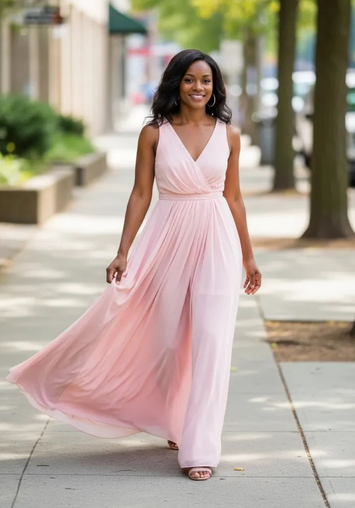 This look features a flowing pink maxi dress with a light airy fabric that moves gracefully while walking. The soft blush tone feels romantic and fresh. The full length silhouette adds elegance to the all pink aesthetic.