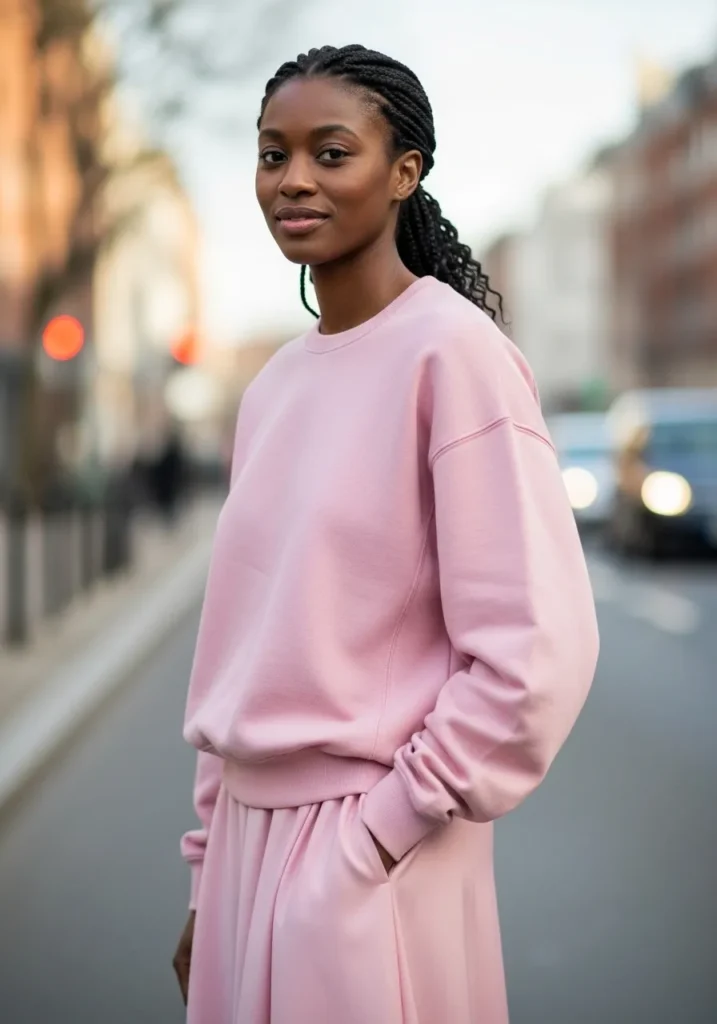 This outfit features a relaxed pink sweatshirt styled with matching pink bottoms for a casual all pink moment. The fabric looks soft and lived in, giving the outfit a cozy and approachable feel. The monochrome styling keeps it clean and aesthetic.