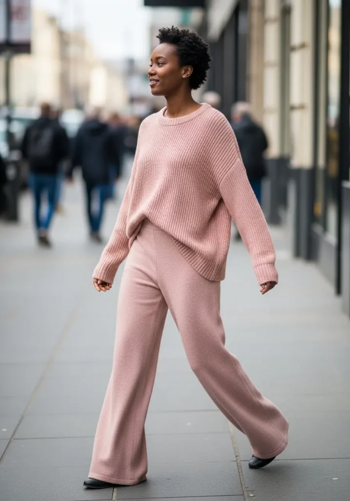 This look showcases a pink knit top paired with matching wide leg knit pants. The texture adds depth while the silhouette stays relaxed and flattering. The color feels warm and cohesive from head to toe.
