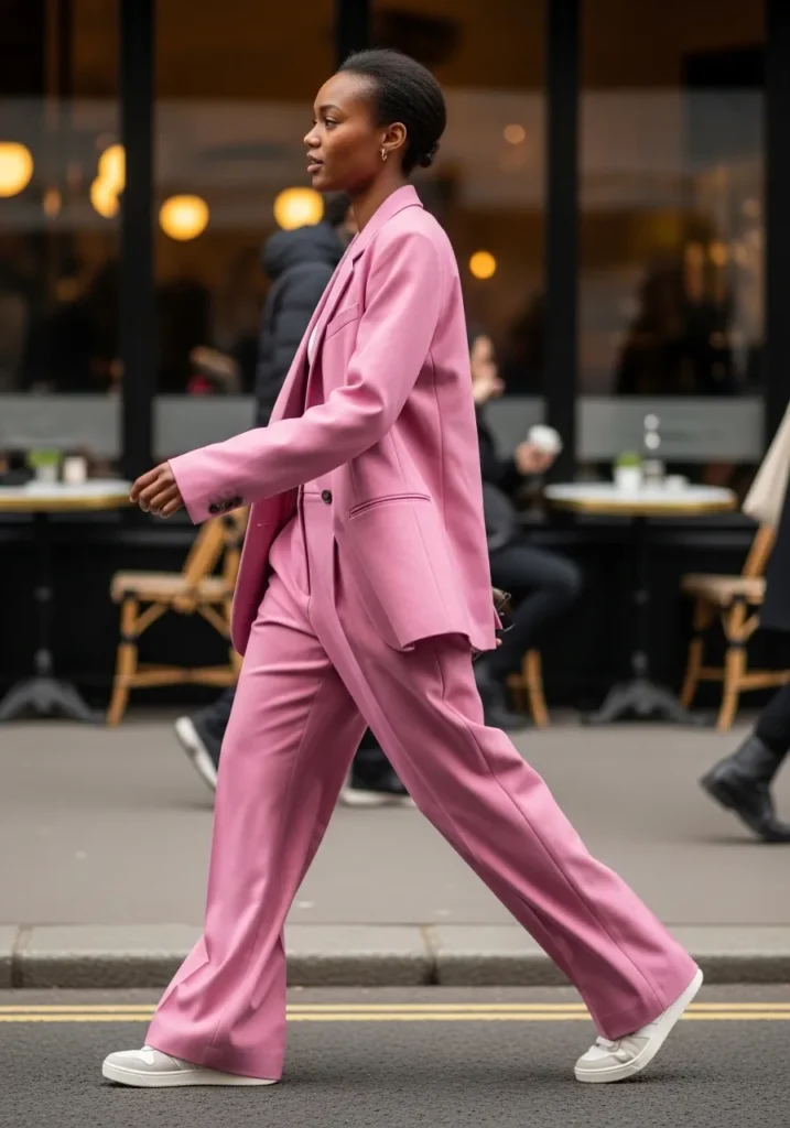 This look features a tailored pink blazer paired with matching wide leg trousers for a clean and confident silhouette. The fabric feels structured but wearable, creating a polished head to toe pink moment. The overall vibe feels modern and quietly powerful.