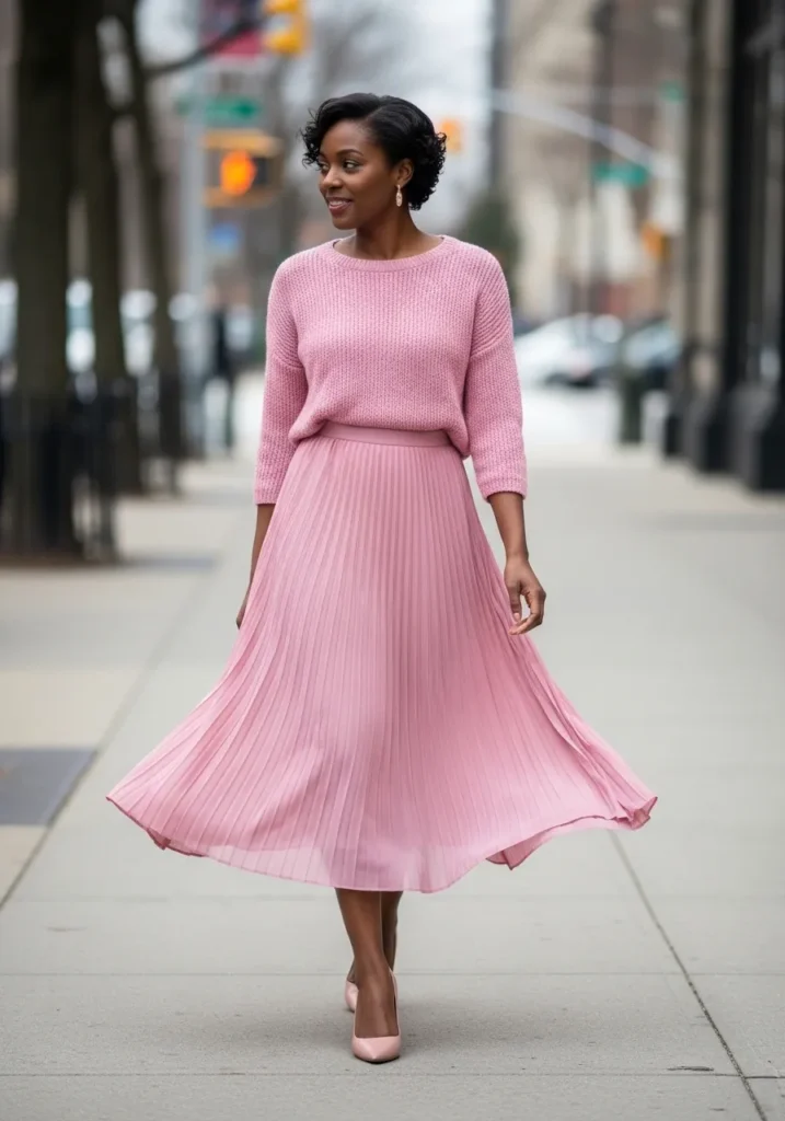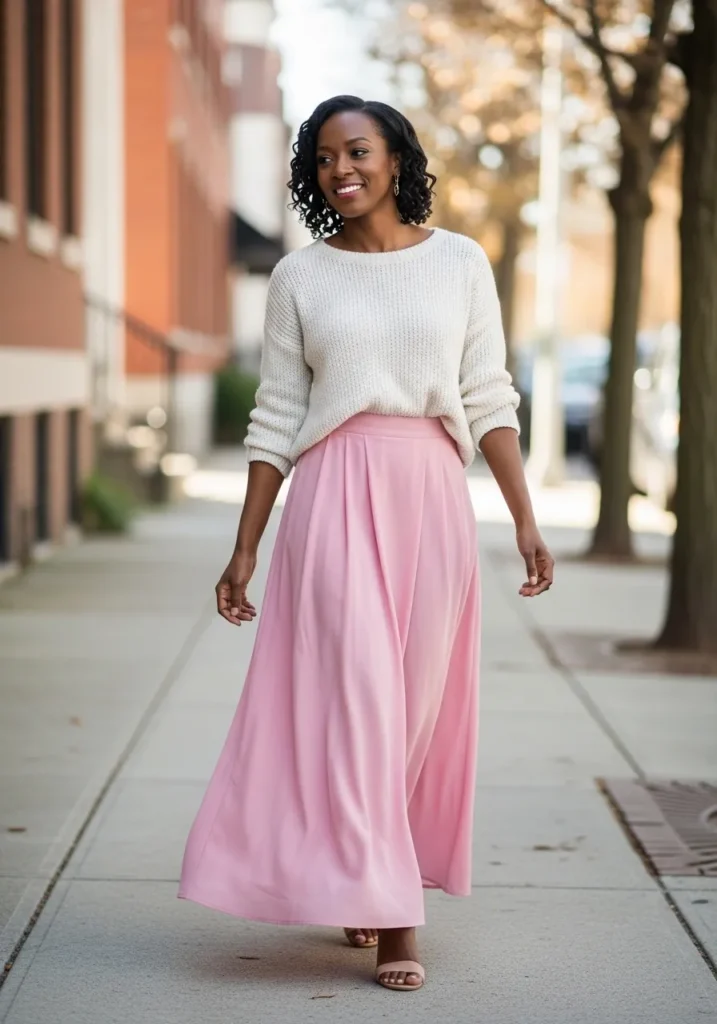This outfit features a flowing soft pink maxi skirt paired with a light knit top in a matching pink tone. The skirt moves gently while walking and the knit adds a cozy texture that balances the look. The overall vibe feels relaxed, feminine, and very dreamy.