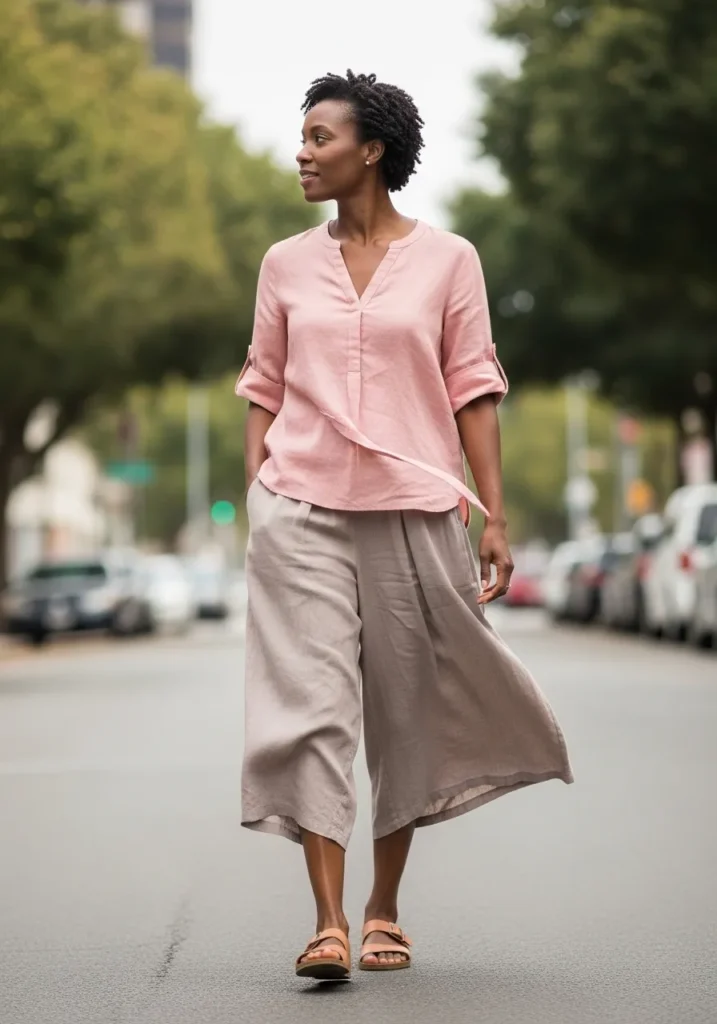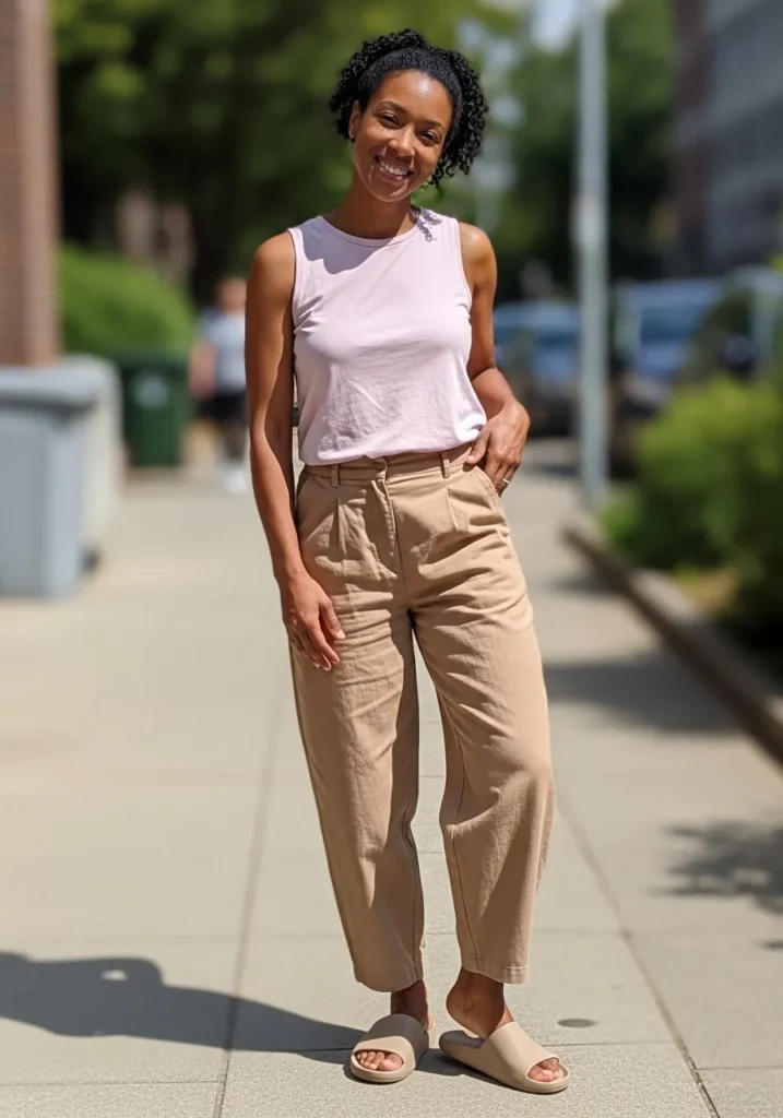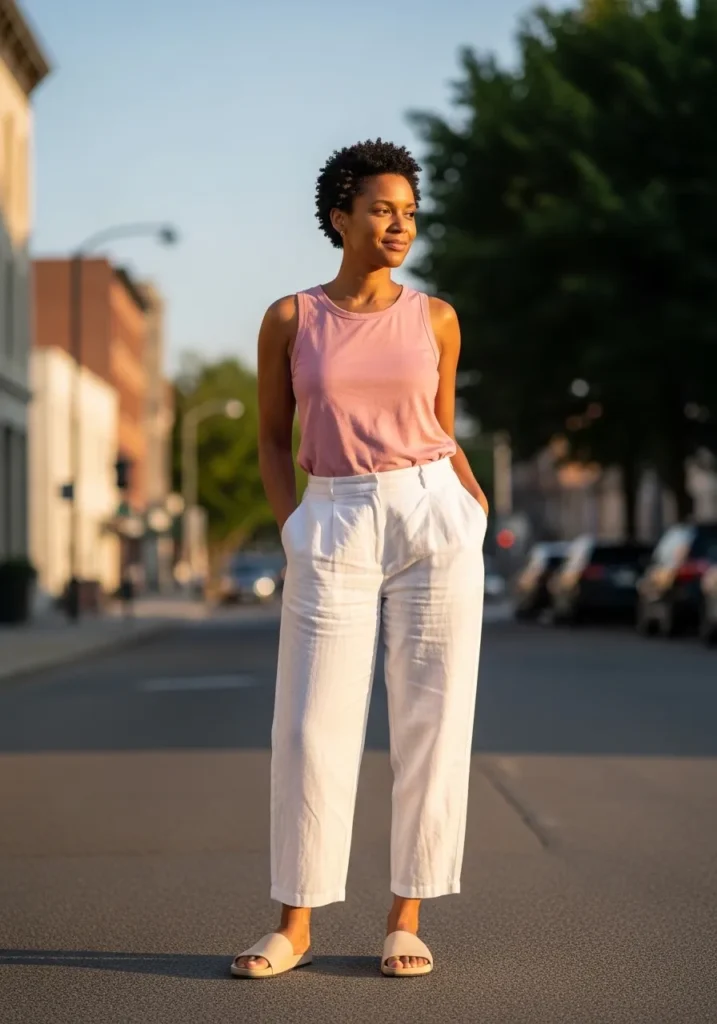 This outfit pairs a soft pink sleeveless tank with crisp white linen pants and flat sandals.