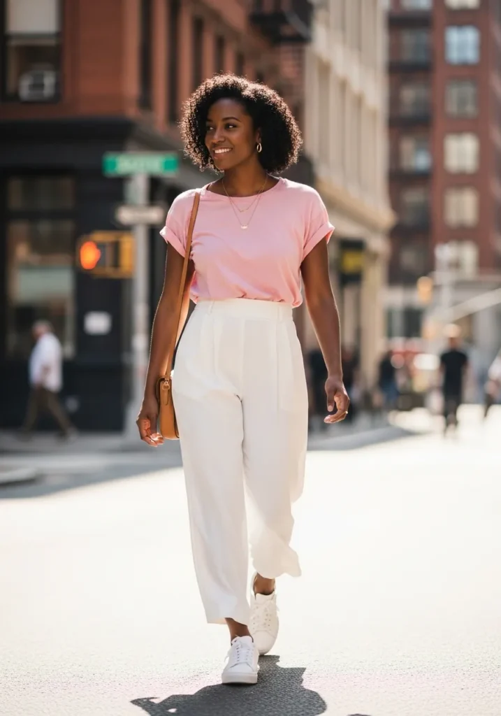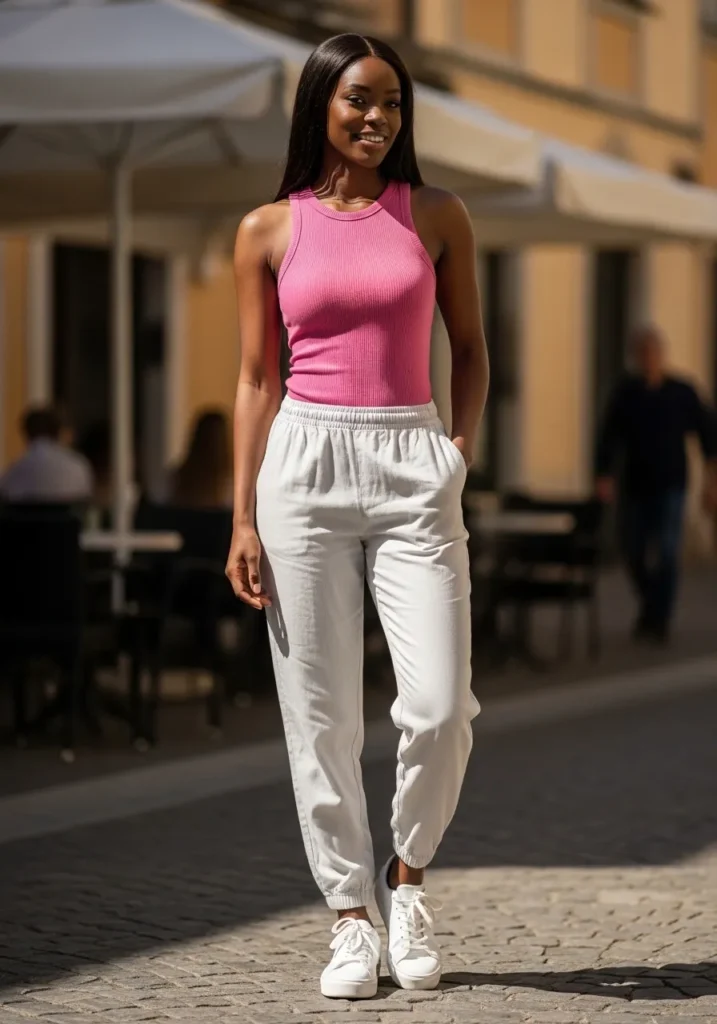 This look features a pink sleeveless tank styled with relaxed white jogger pants and sneakers.
