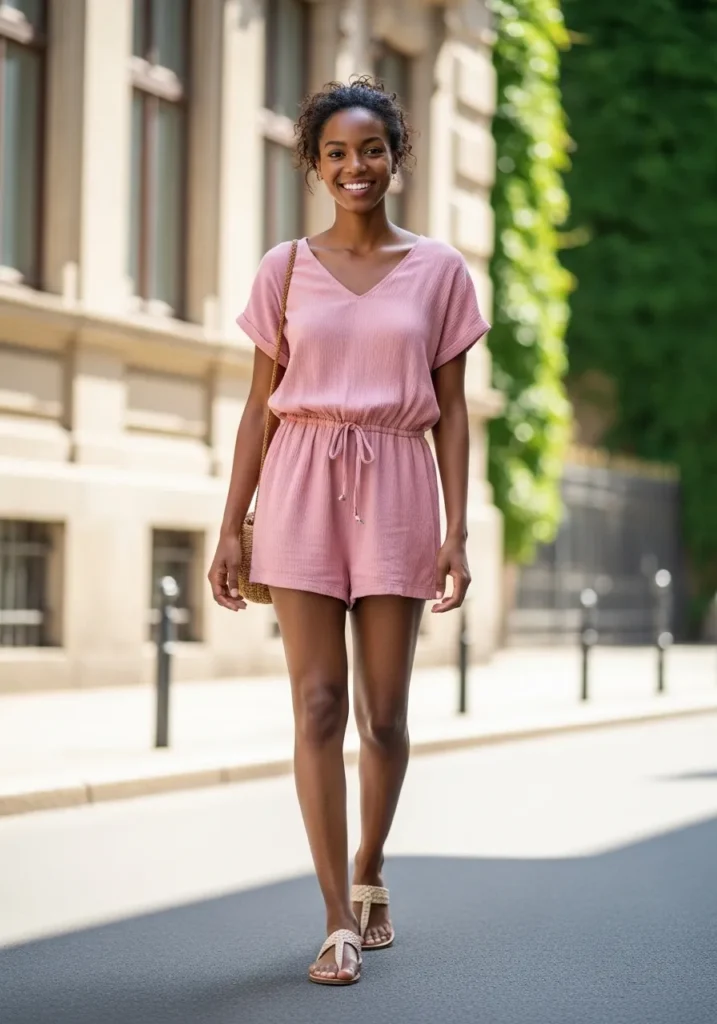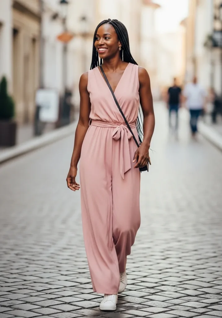 This outfit features a soft pink wrap style jumpsuit with a relaxed fit and comfortable sandals.
