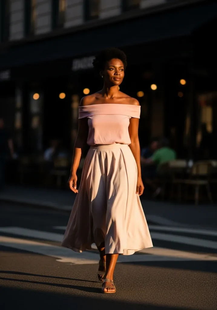 The skirt adds movement while the blouse keeps the look polished and relaxed.