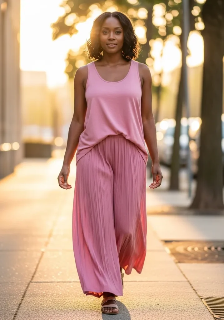 This look features a pink sleeveless top paired with matching flowy pants and sandals.