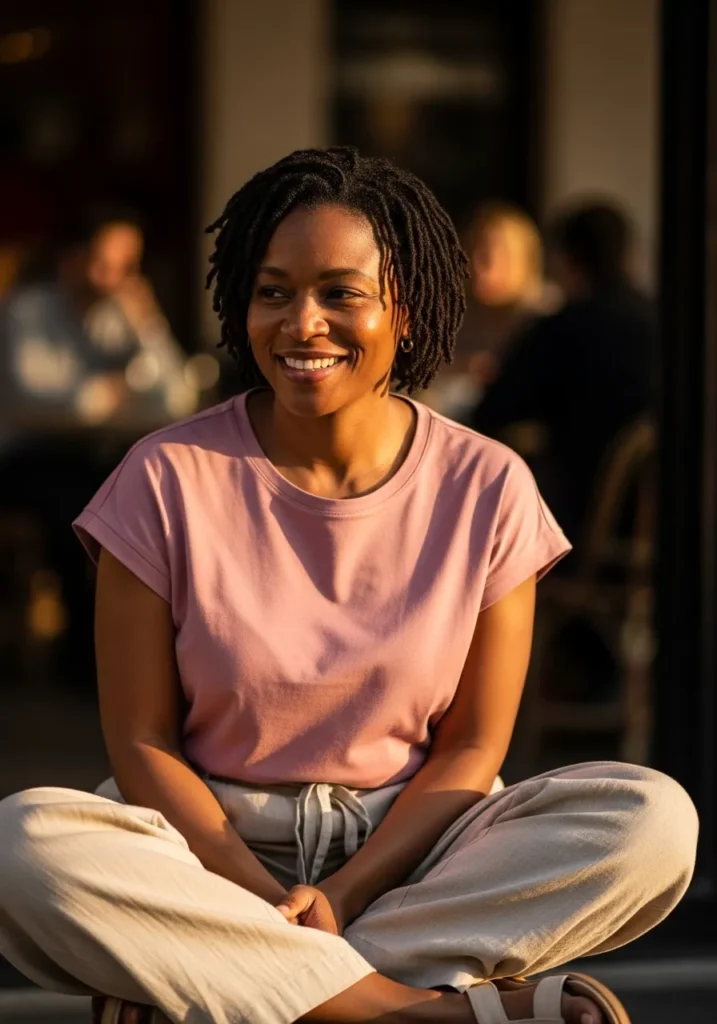 This look pairs a soft pink T shirt with loose neutral lounge pants for a casual vacation moment.