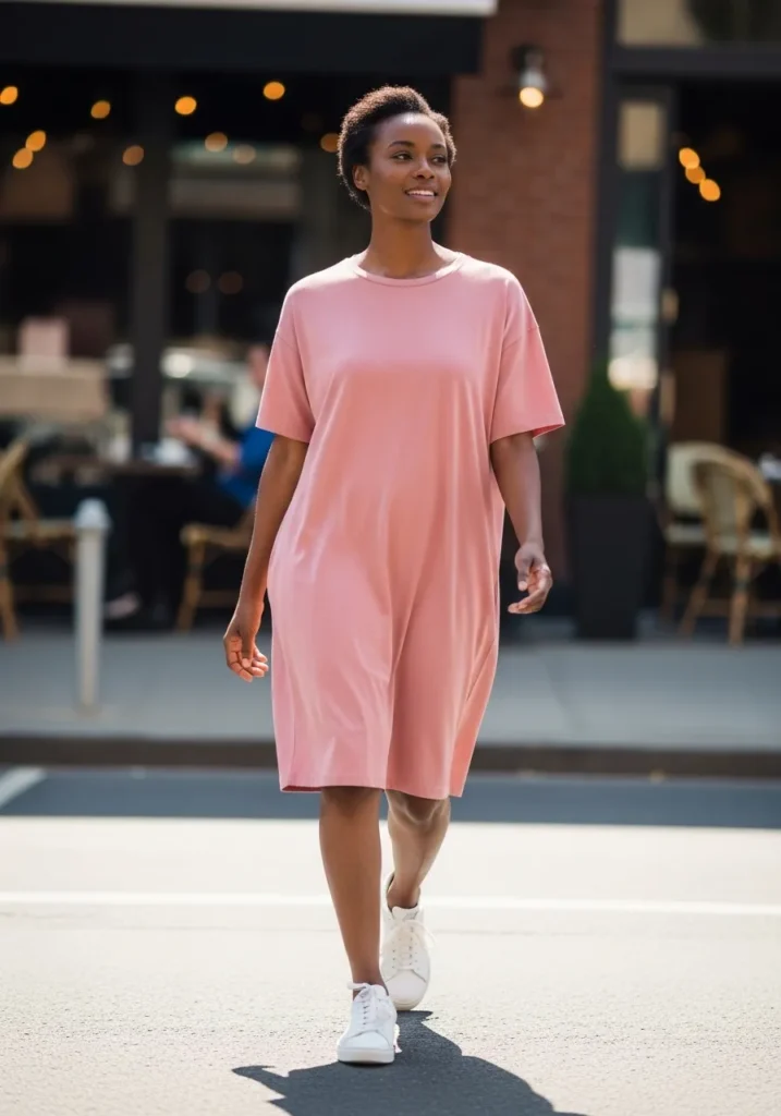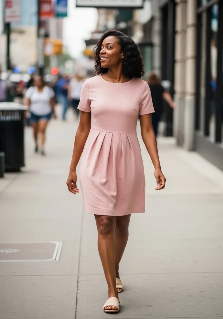 This look features a soft pink skater dress with a comfortable loose fit and flat sandals.