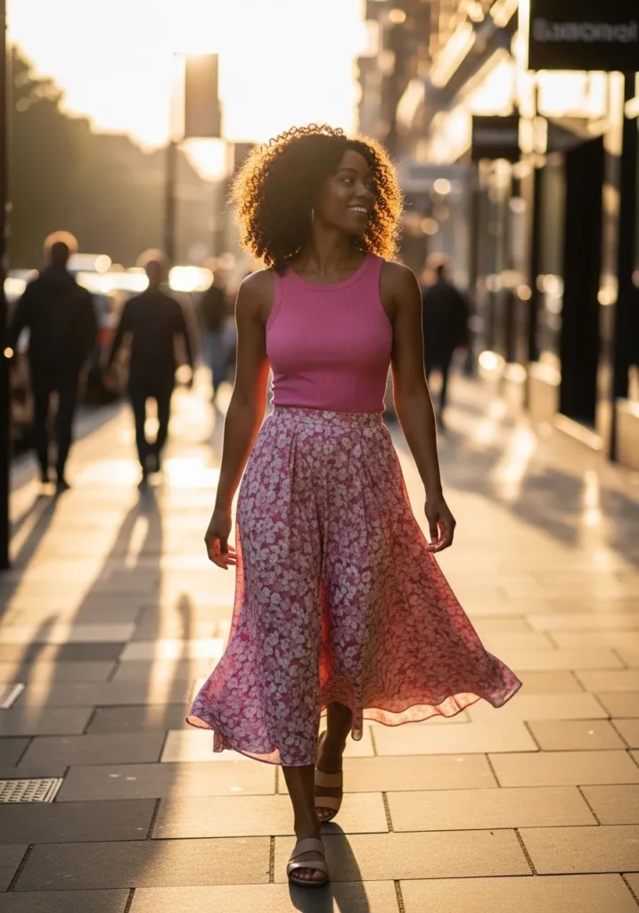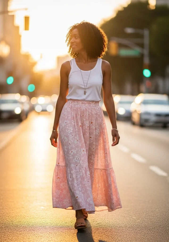 This outfit pairs a soft pink tank top with a lightweight flowy skirt and flat sandals.