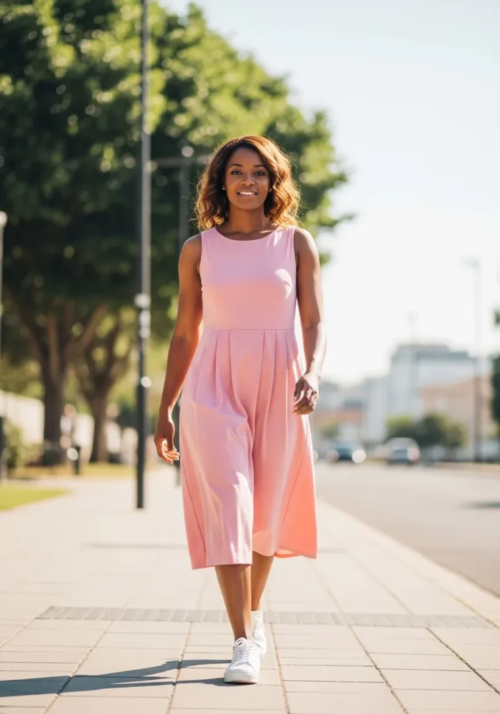 This look features a pink sleeveless midi dress paired with white sneakers.