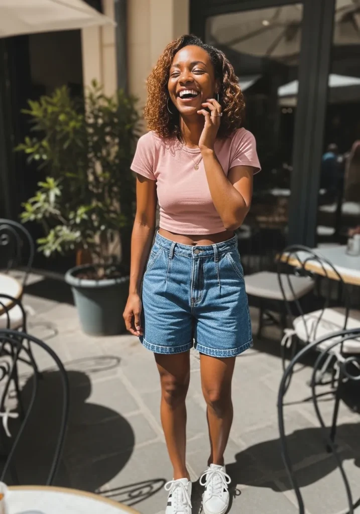This look pairs a soft pink T shirt with classic denim shorts and sneakers.