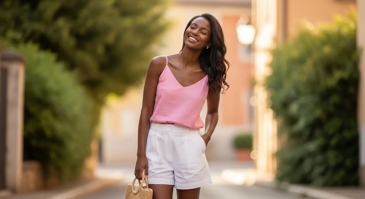 This outfit pairs a bright pink tank top with relaxed white shorts and flat sandals.