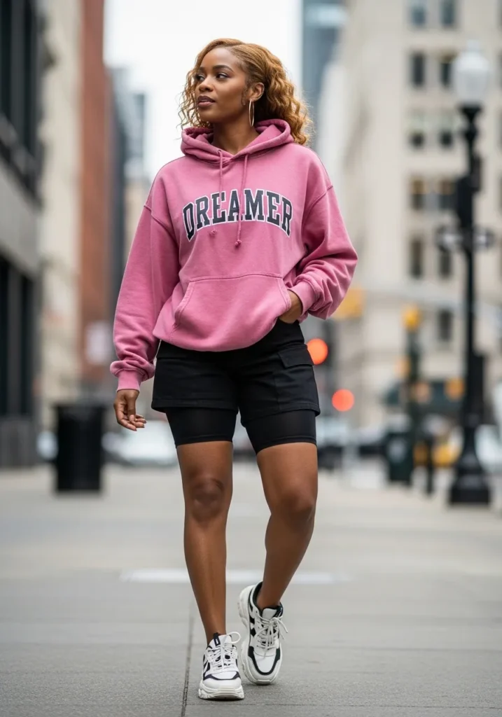 This outfit pairs an oversized pink graphic sweatshirt with fitted black shorts and classic white sneakers. The soft cotton sweatshirt brings that cozy street vibe while the shorts keep things sharp and sporty. The relaxed fit and casual styling feel effortless but still bold enough for city walking days.