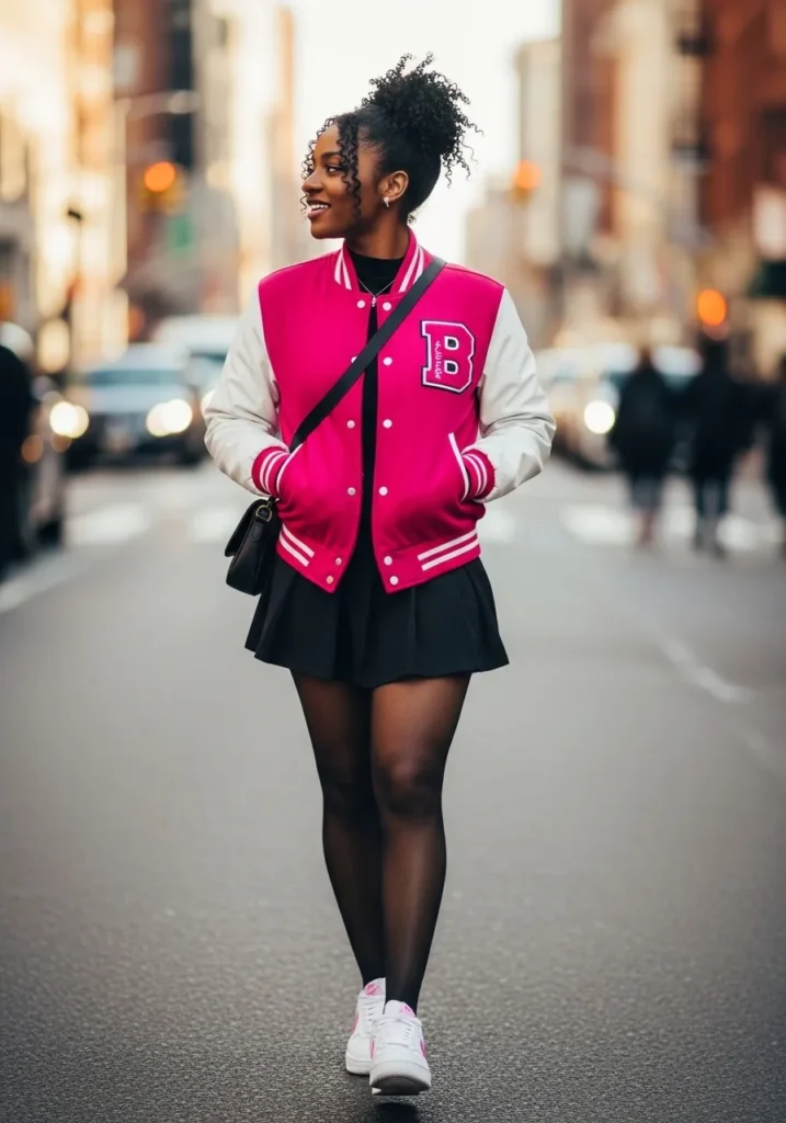 A bold pink varsity jacket is styled with a black mini skirt, sheer tights, and white sneakers. The jacket brings that sporty streetwear energy while the skirt keeps the look playful and flirty. The mix feels youthful but still very current.