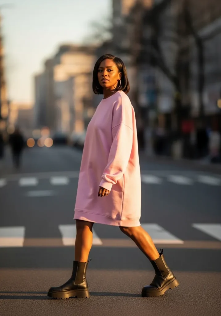 This look centers around an oversized pink sweatshirt worn as a dress and paired with chunky black boots. The loose fit gives it an effortless edge while the boots ground the look with attitude. It feels relaxed but intentional.