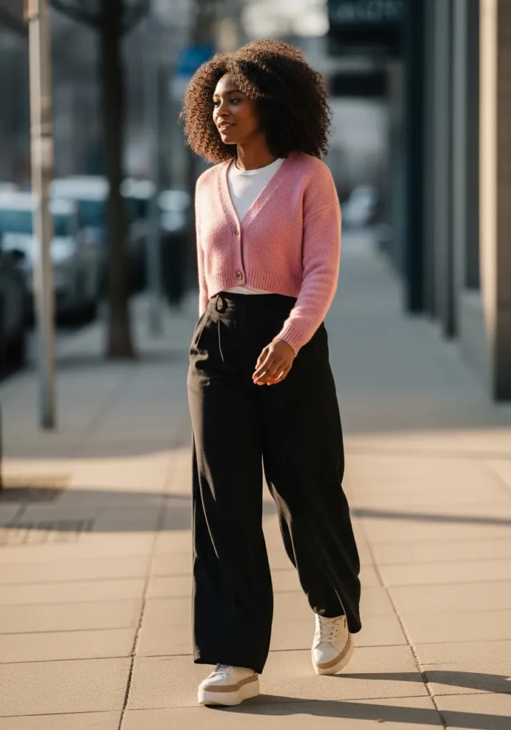 A cropped pink jacket paired with flowy black wide leg pants gives this outfit a bold and modern feel. The shorter jacket shows off the waist while the pants add movement and drama. Sneakers make it practical for everyday wear.