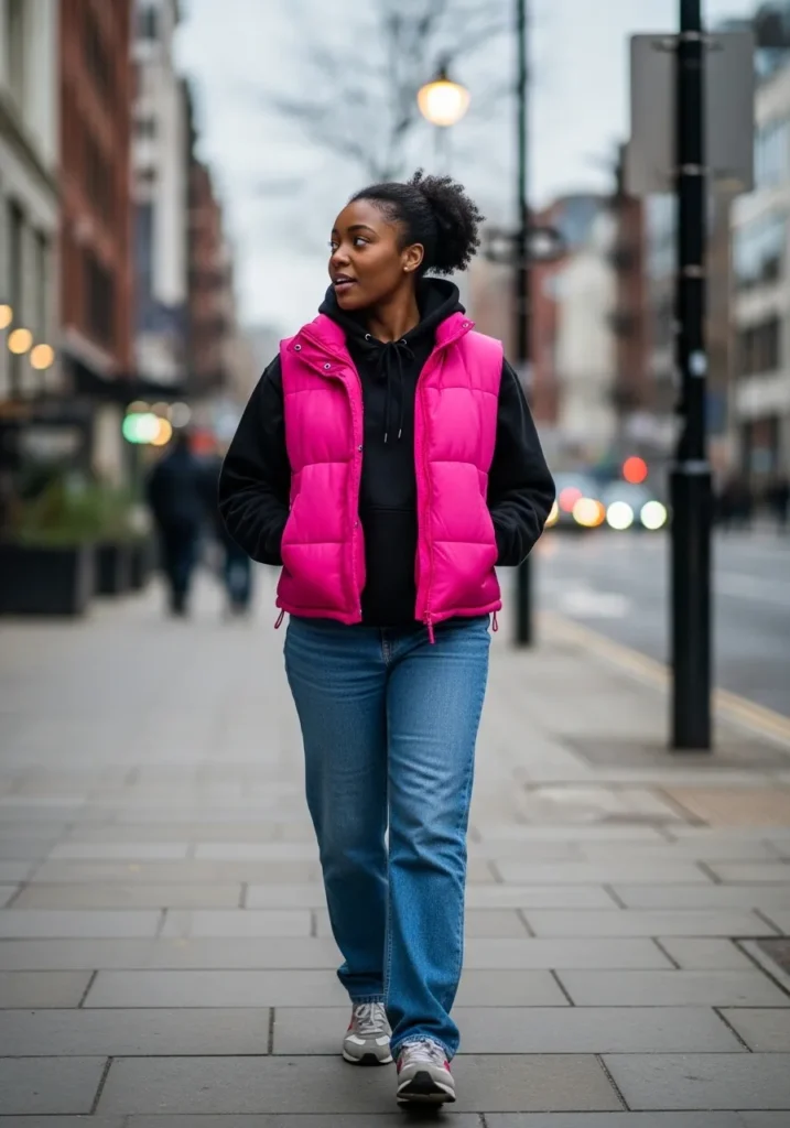 A bright pink puffer vest layered over a dark top and straight leg jeans creates a sporty streetwear vibe. The vest adds volume and color, while the jeans keep things grounded and casual. Sneakers finish it off cleanly.