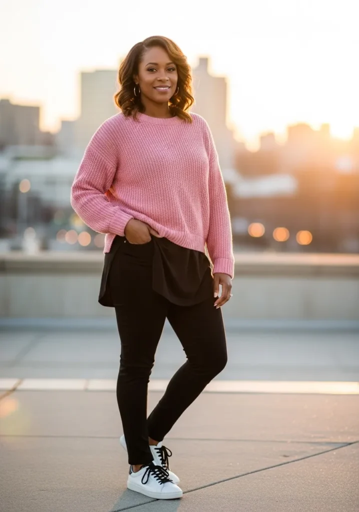 This look features a soft pink sweater paired with black joggers and casual sneakers. The sweater adds warmth and softness while the joggers keep the outfit relaxed and urban. The vibe is cozy street style with confidence.