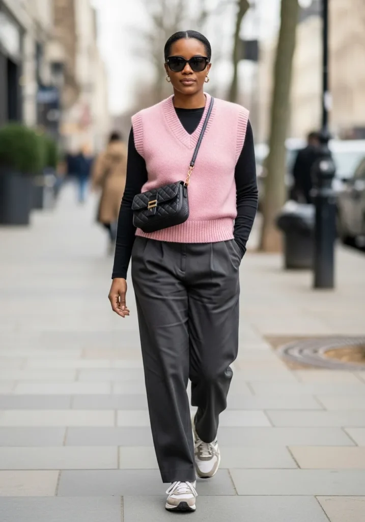 A sleeveless pink sweater is layered over a fitted black long sleeve top and styled with tailored gray trousers and sneakers. The clean lines and soft pink color keep the outfit modern, while the trousers add polish and structure. It feels sleek and intentional.