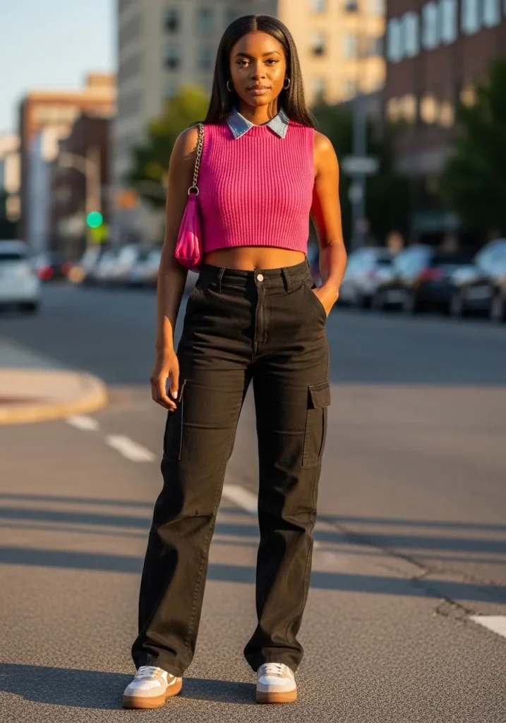 A sleeveless pink top tucked into structured black cargo pants creates a clean and edgy silhouette. The cropped cut highlights the waist while the cargo details add texture and attitude. Finished with sneakers, the whole look feels modern and street ready.