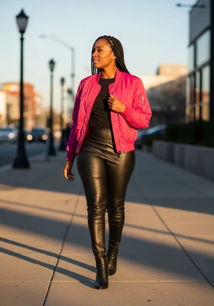 This look features a bright pink jacket layered over a dark top and sleek black leather pants. The fitted jacket adds polish while the leather pants bring instant edge. Everything feels sharp and intentional without looking stiff.