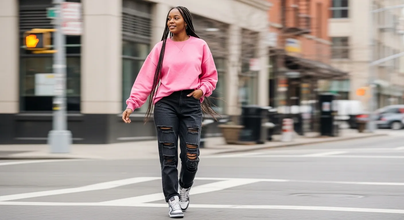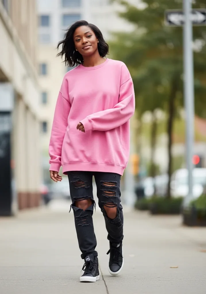 An oversized pink sweater styled with ripped black jeans creates a relaxed but edgy streetwear vibe. The loose top balances the distressed denim perfectly, while sneakers keep it grounded and wearable. The pink softens the rough details just enough.