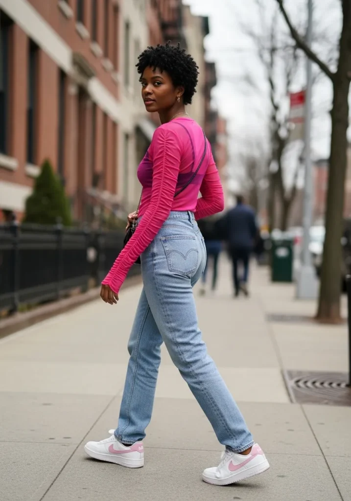 This outfit keeps things simple with a fitted pink long sleeve top and classic light wash jeans. The clean lines and minimal styling let the color shine. White sneakers finish it off with a fresh street look.