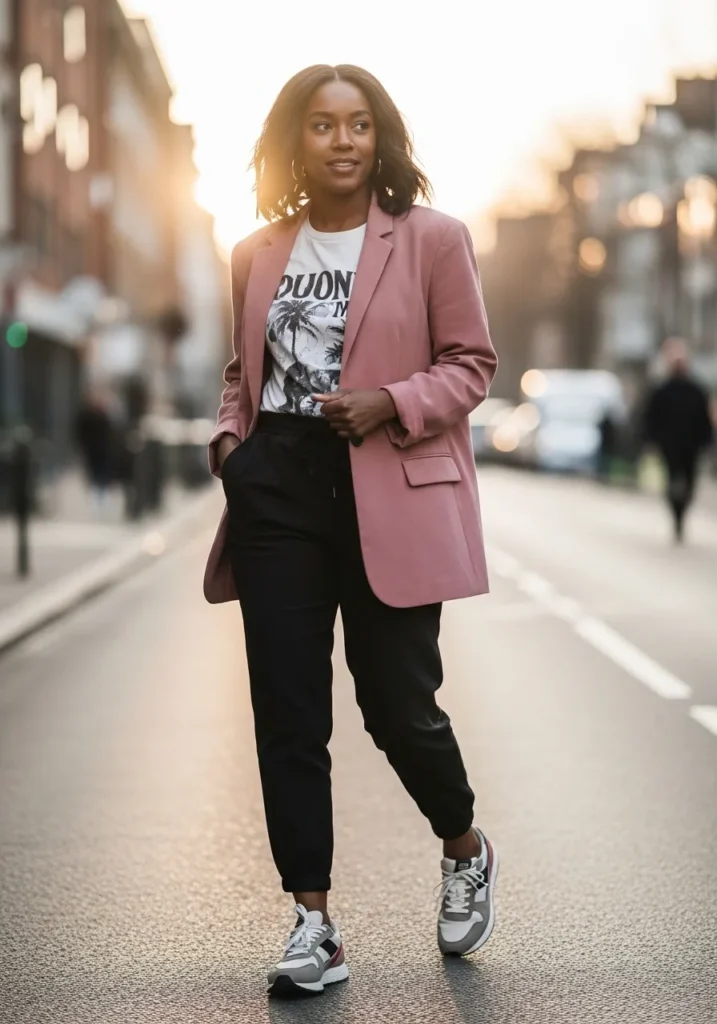 A soft pink blazer layered over a graphic tee and black joggers creates a high low street style mix. The blazer adds structure while the joggers keep it relaxed and modern. Sneakers tie the whole look together.