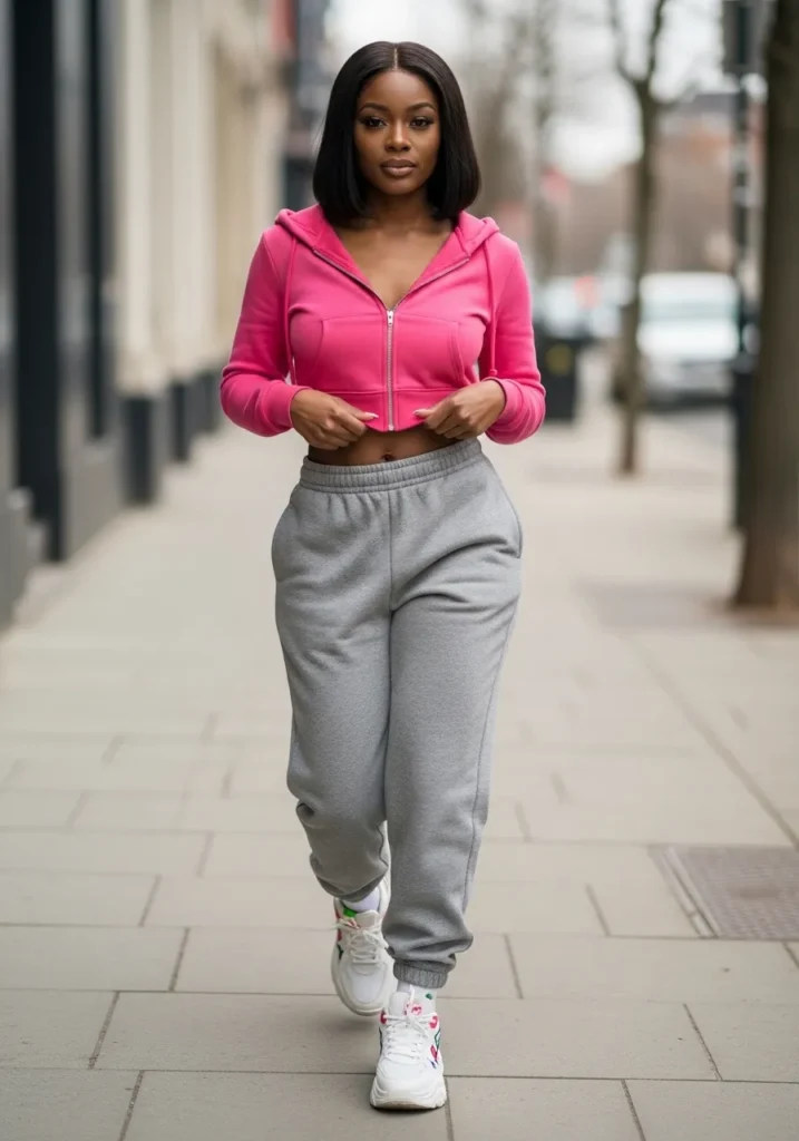 A cropped pink hoodie paired with gray sweatpants gives this look a sporty streetwear edge. The cropped fit keeps it flattering while the sweatpants add comfort and ease. Clean sneakers finish the vibe.