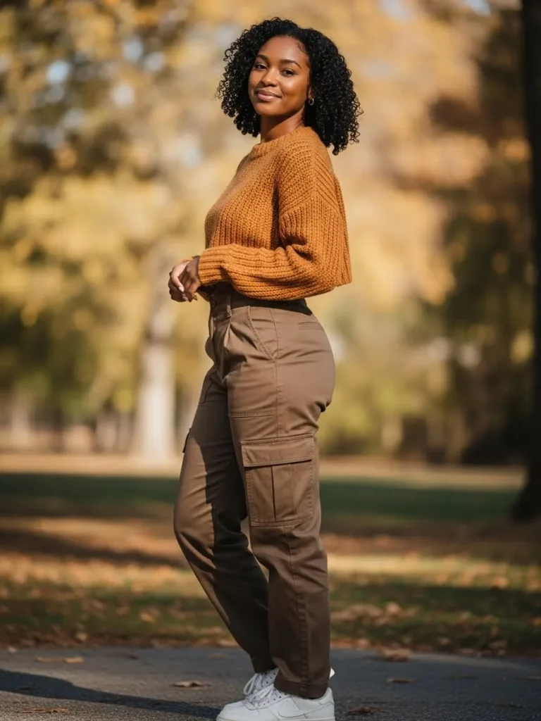 This look pairs a chunky rust colored knit sweater with relaxed brown cargo pants and clean white sneakers. The mix of soft knit and structured pants gives the outfit balance and an effortless fall vibe.