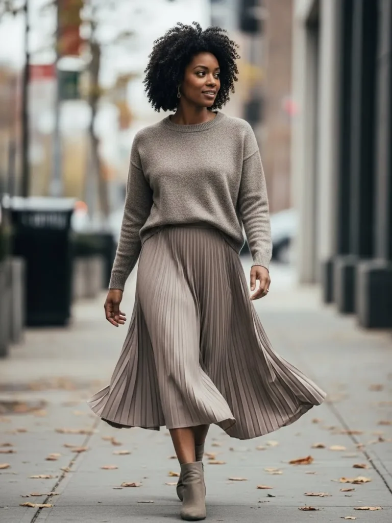 This outfit features a soft taupe sweater tucked into a flowing pleated midi skirt in a matching neutral tone. Ankle boots keep it grounded while the movement of the skirt adds a touch of elegance.