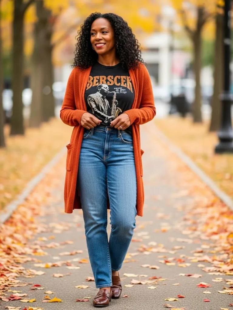 This outfit pairs a black graphic tee with a warm rust colored long cardigan and classic blue jeans. Brown loafers finish the look with a casual but polished touch.