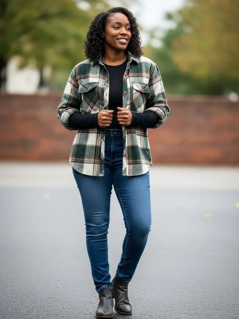 This outfit features a classic green and cream plaid shirt jacket layered over a fitted black long sleeve top and dark blue skinny jeans. Black ankle boots ground the look and give it a clean fall finish that feels casual and easy.