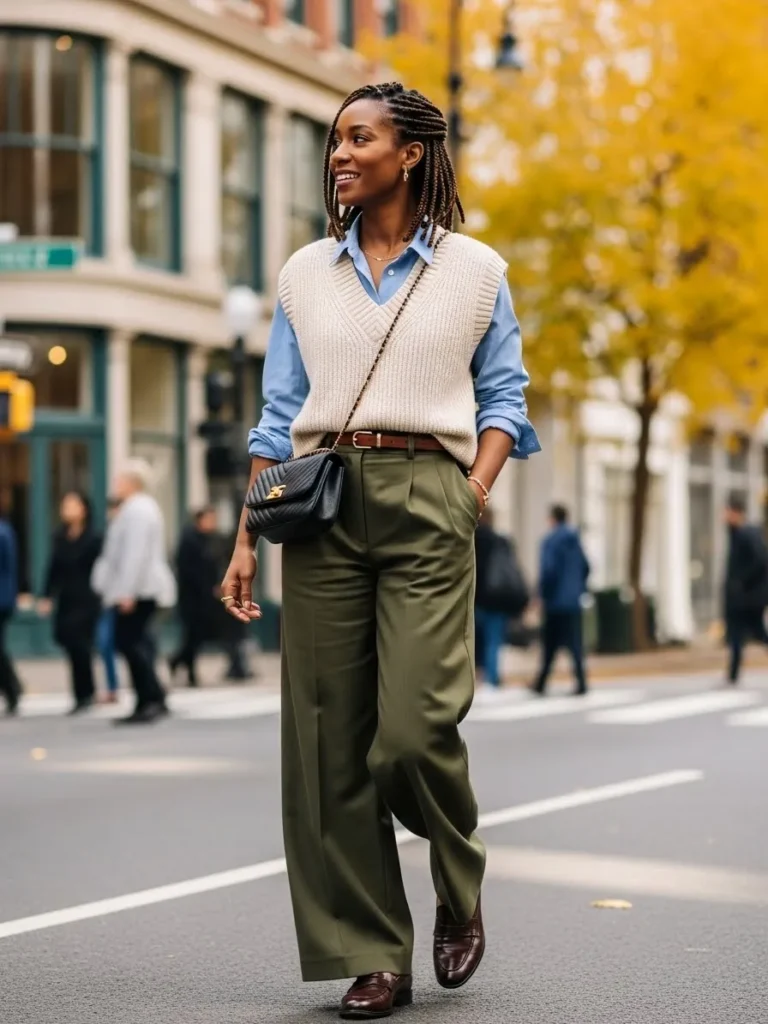 This look pairs a soft cream sweater vest with a light blue button down shirt and olive wide leg trousers. Brown loafers and a structured crossbody bag add polish while keeping everything relaxed and wearable.