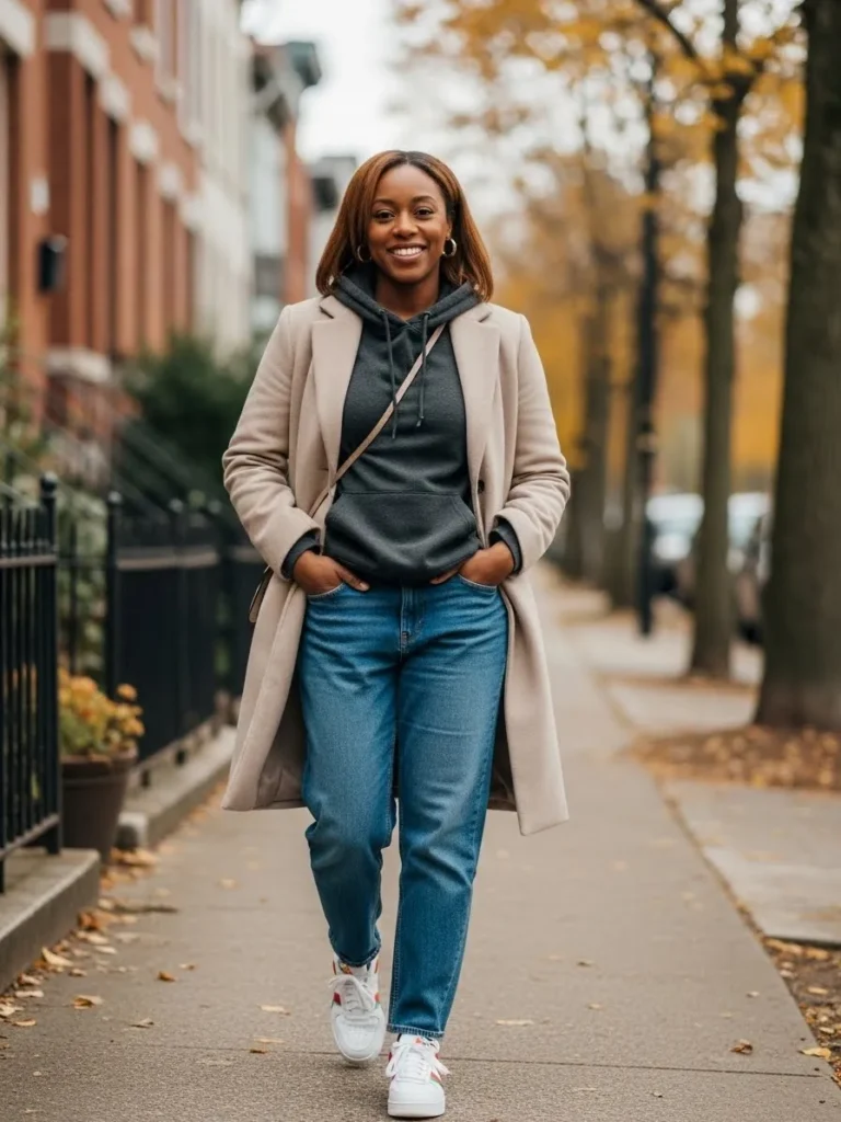 This outfit combines a charcoal hoodie with a light neutral long coat and classic blue jeans. White sneakers keep it casual and comfortable while the coat adds just enough structure.