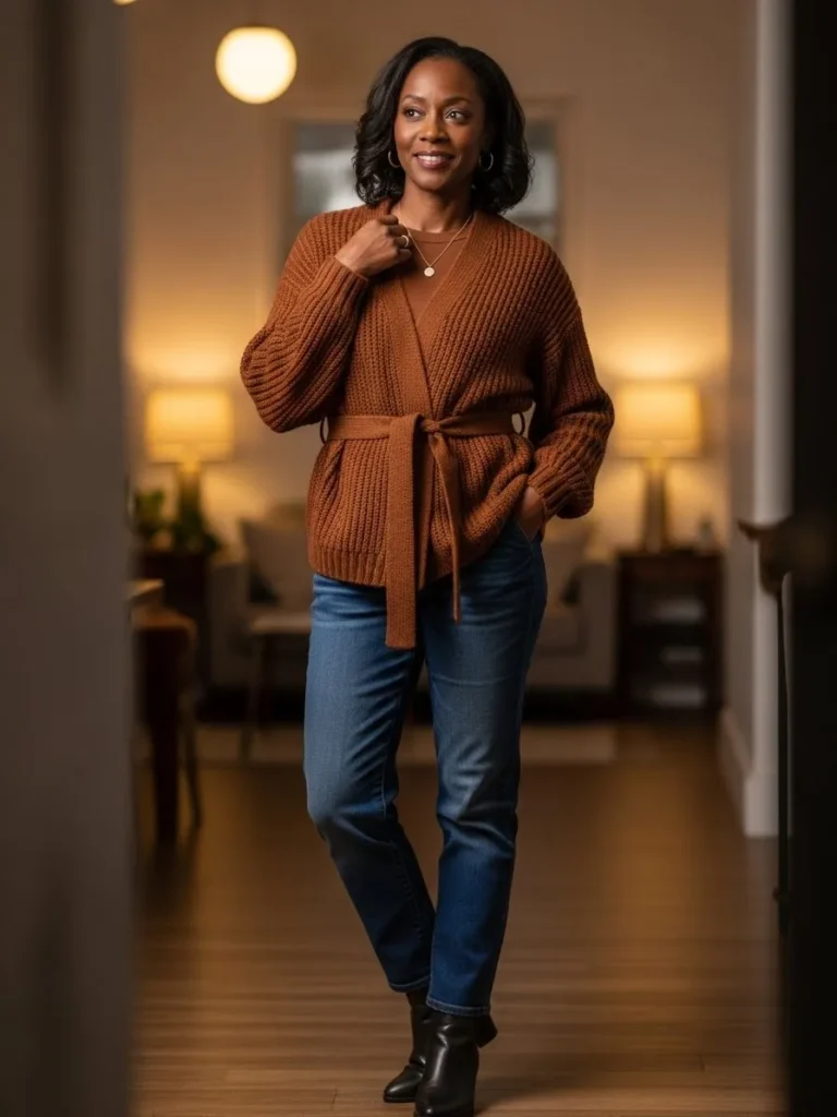 This look features a warm rust colored knit cardigan cinched at the waist over a simple top and blue jeans. Black ankle boots and minimal jewelry keep the outfit feeling cozy and polished.