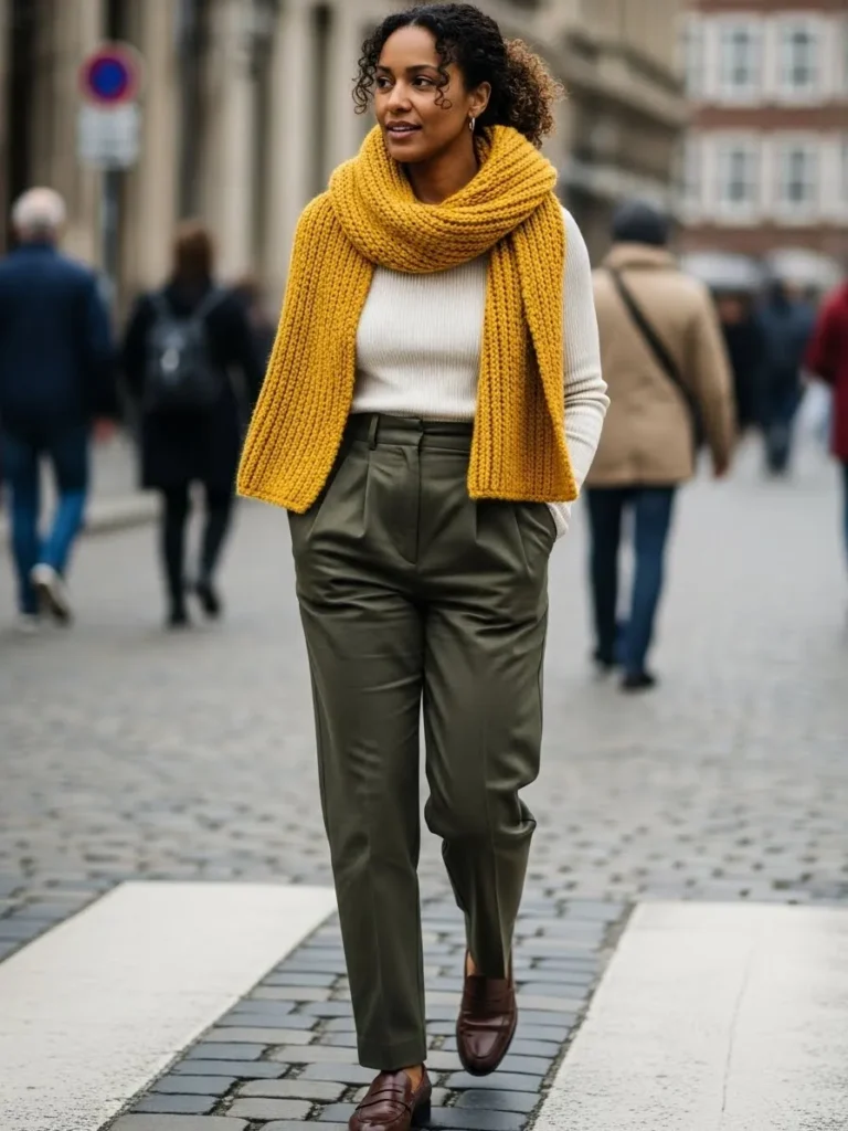 This outfit pairs a soft cream sweater with olive tailored pants and a chunky mustard scarf. Brown loafers add a classic touch that fits perfectly with the fall color palette.