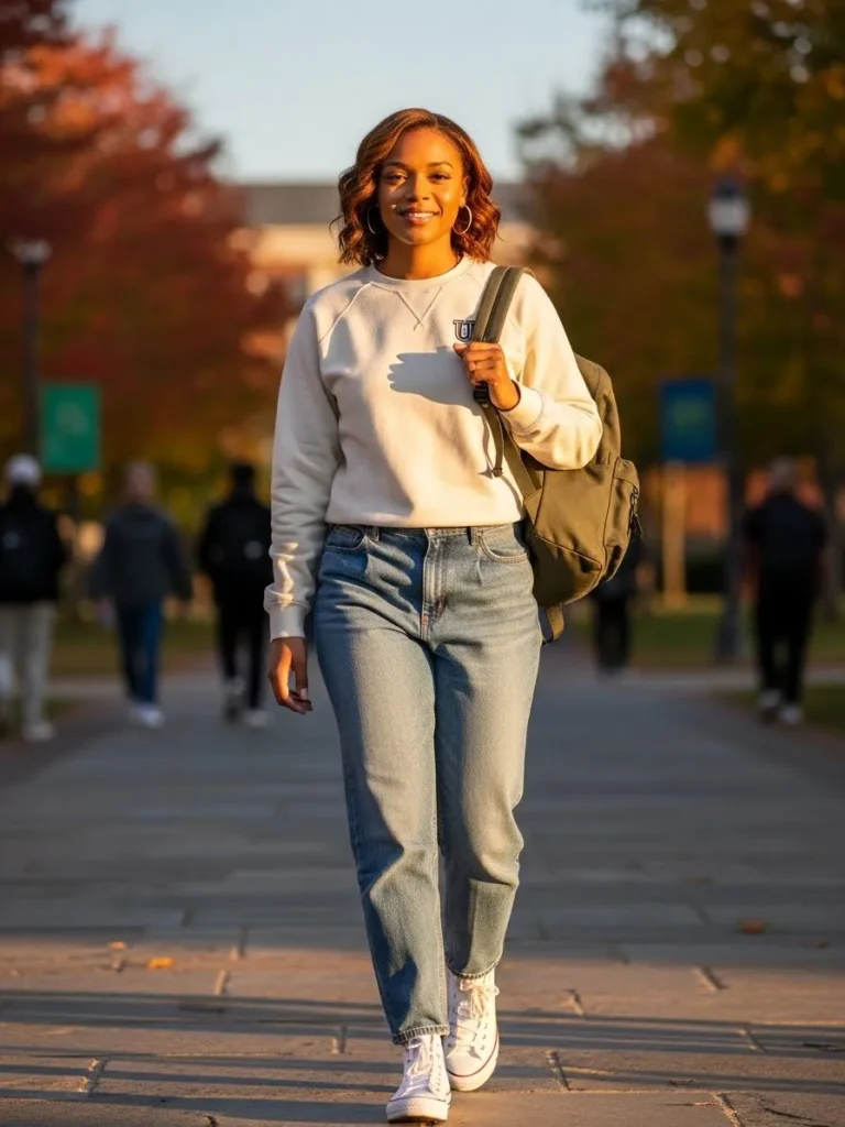 This outfit features a simple light colored sweatshirt paired with relaxed straight leg jeans and white sneakers. A backpack adds a casual everyday vibe that feels very real and wearable.
