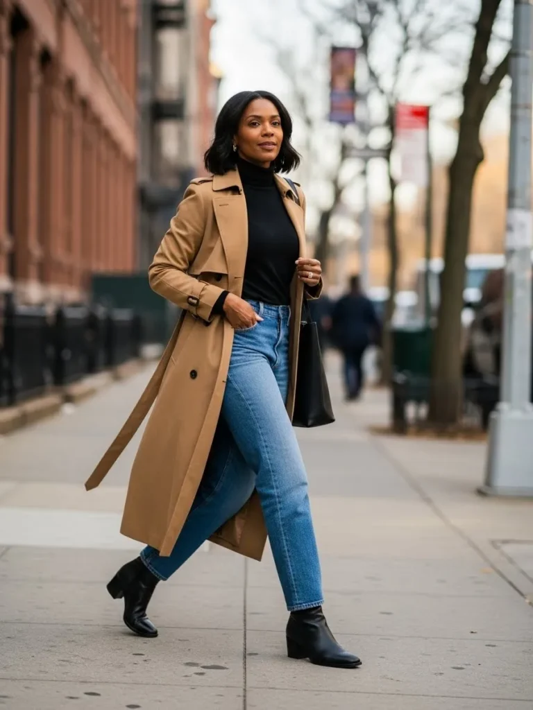 This outfit features a timeless camel trench coat layered over a fitted black top and straight leg blue jeans. Black ankle boots and a structured handbag add polish while keeping the look grounded and wearable.