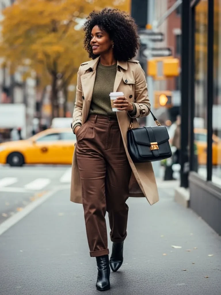 This look pairs a classic beige trench coat with an olive knit sweater and rich brown tailored trousers. Black ankle boots and a structured handbag elevate the outfit while keeping it practical for city walks.