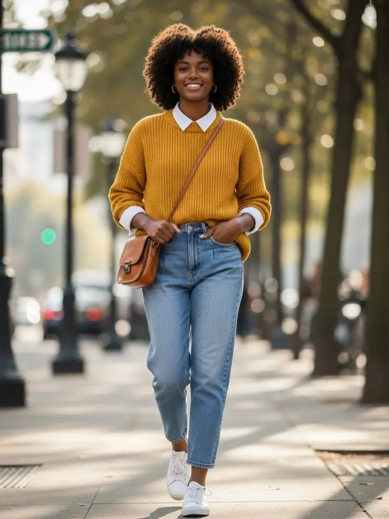 This outfit features a cozy mustard knit sweater layered over a crisp white collared shirt and relaxed blue jeans. White sneakers and a small crossbody bag keep the vibe casual and fresh.
