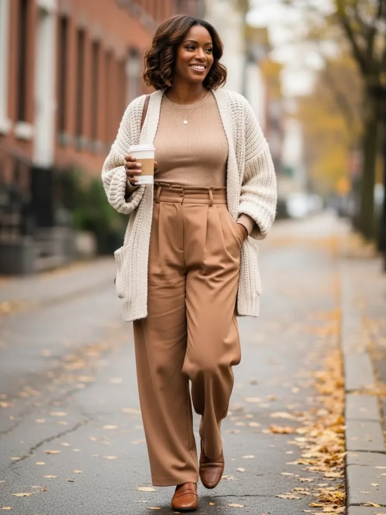 This look pairs a soft beige knit cardigan with a fitted neutral top and high waisted tailored trousers. Brown loafers add warmth and balance while keeping the outfit comfortable.